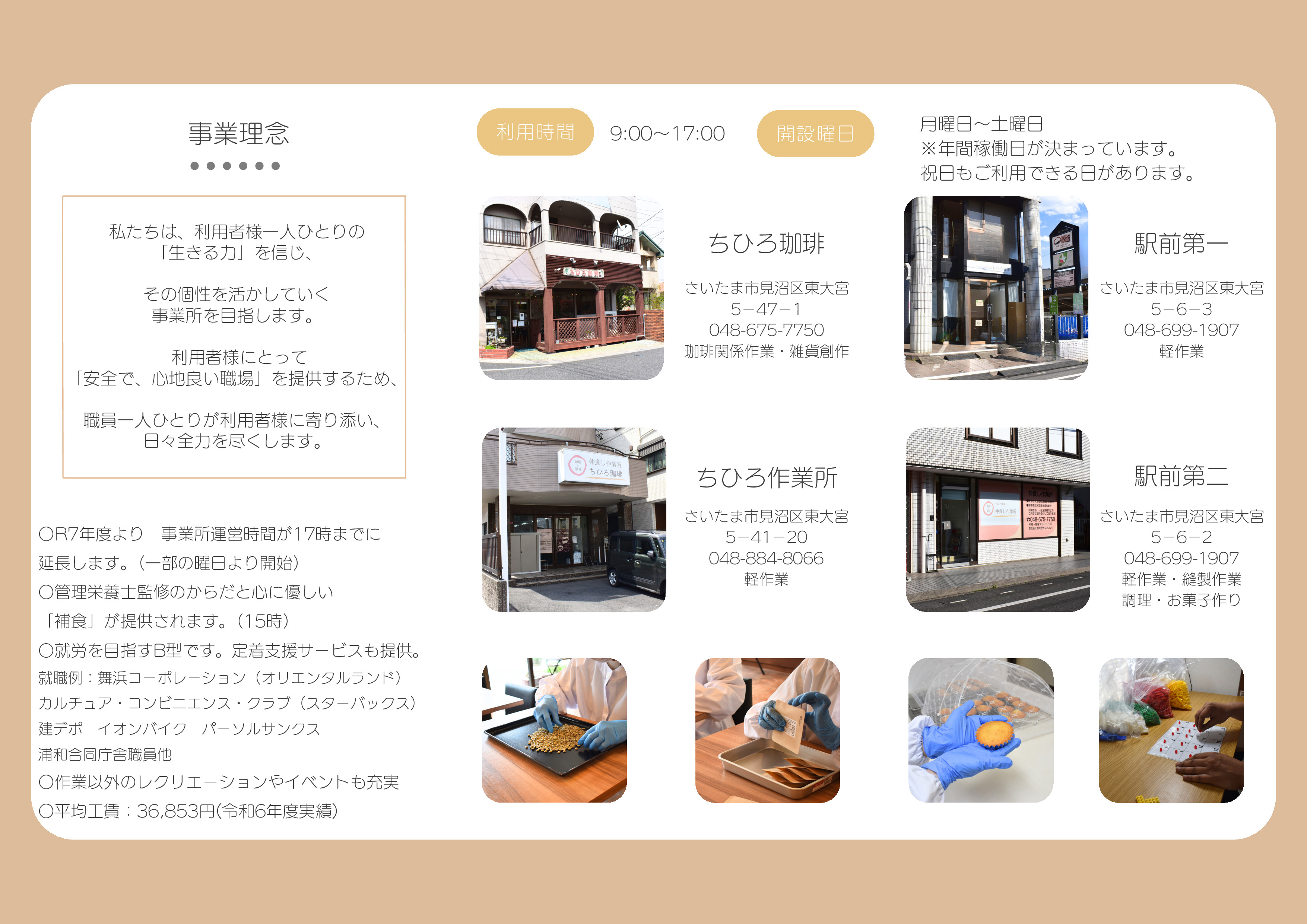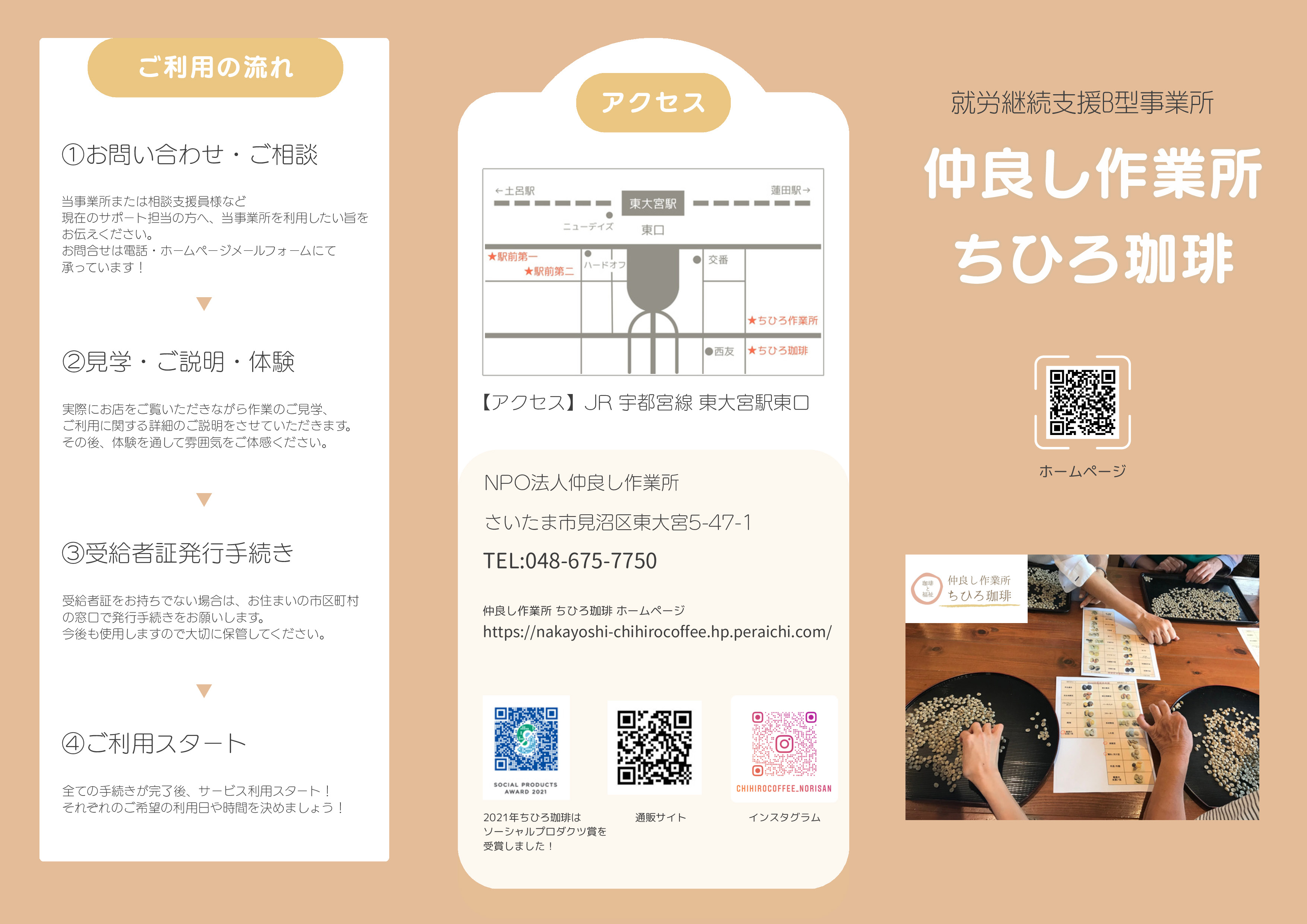 | 備考 | 福祉事業所としていち早くAIによる体調・感情チェックソフトを導入し、日々の業務に活かしています。悩みや課題に寄り添い、あなたの個性を伸ばせる事業所です。 ちひろ珈琲は、利用者の悩みや課題に寄り添い、一緒に歩んでいく事業所を目指します。私たちは、一人ひとりが持つ個性を引き出し、どうやって伸ばしていくかという点に重きを置いています。そのため、ちひろ珈琲は「自由に表現できる」「表現したものを認め合う」場として多くの利用者さんに好評いただいています。また、職員間の連携を密にとり、個人、個人に寄り添う支援を行っています。 パンフレットはこちらからご覧いただけます。 【ホームページ】 https://nakayoshi-chihirocoffee.hp.peraichi.com 【お問い合わせ】 048-675-7750 (月曜~土曜9時~17時) |